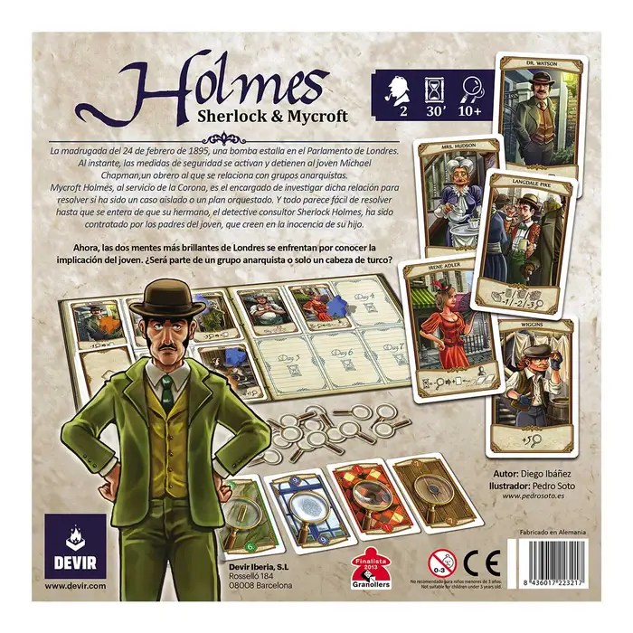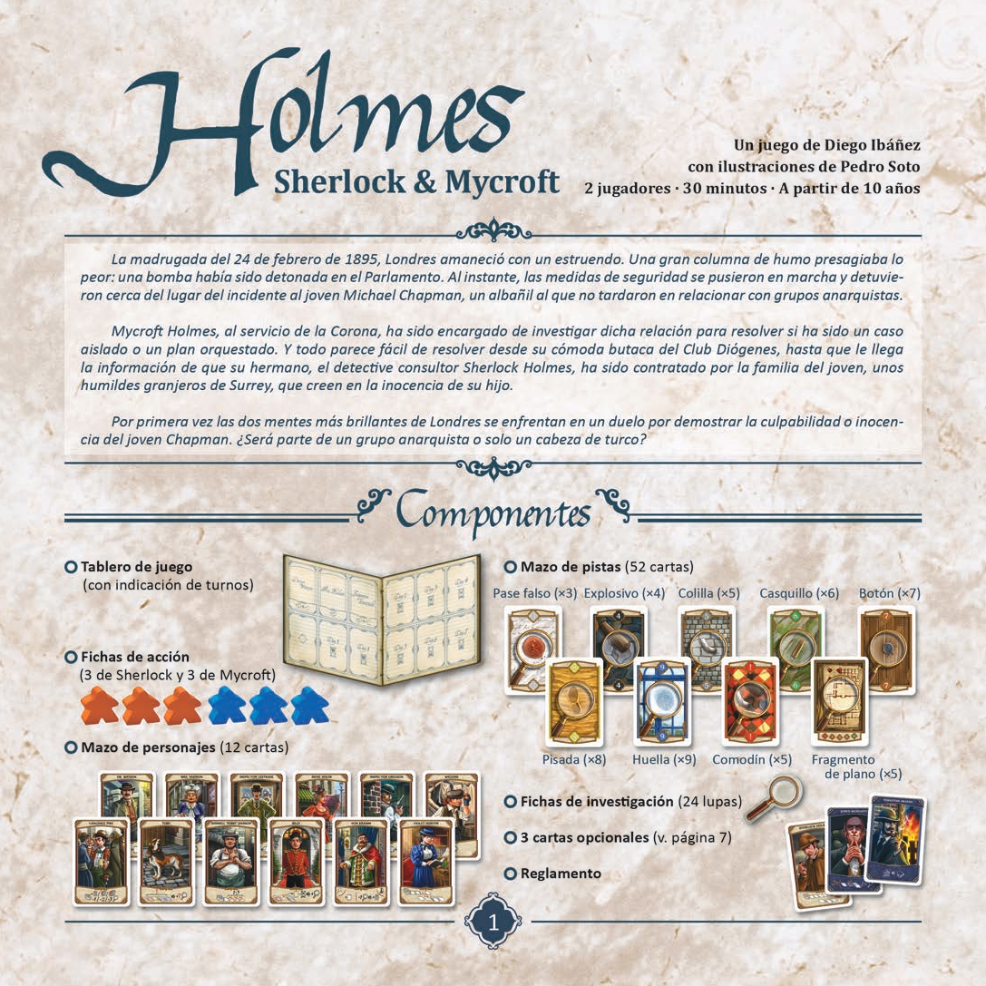 Holmes: Sherlock & Mycroft es un juego de mesa para dos jugadores en el que cada uno asume el papel de uno de los hermanos Holmes, compitiendo por resolver un misterio a través de la recolección de pistas. A lo largo de varias rondas, los jugadores visitan personajes del universo de Sherlock para obtener acciones y evidencias, construyendo estrategias para superar a su oponente. Con partidas rápidas de 20 a 30 minutos, reglas accesibles y una ambientación inspirada en la Londres victoriana, es un duelo estratégico ideal para quienes disfrutan de los juegos de investigación y enfrentamientos tácticos entre dos.