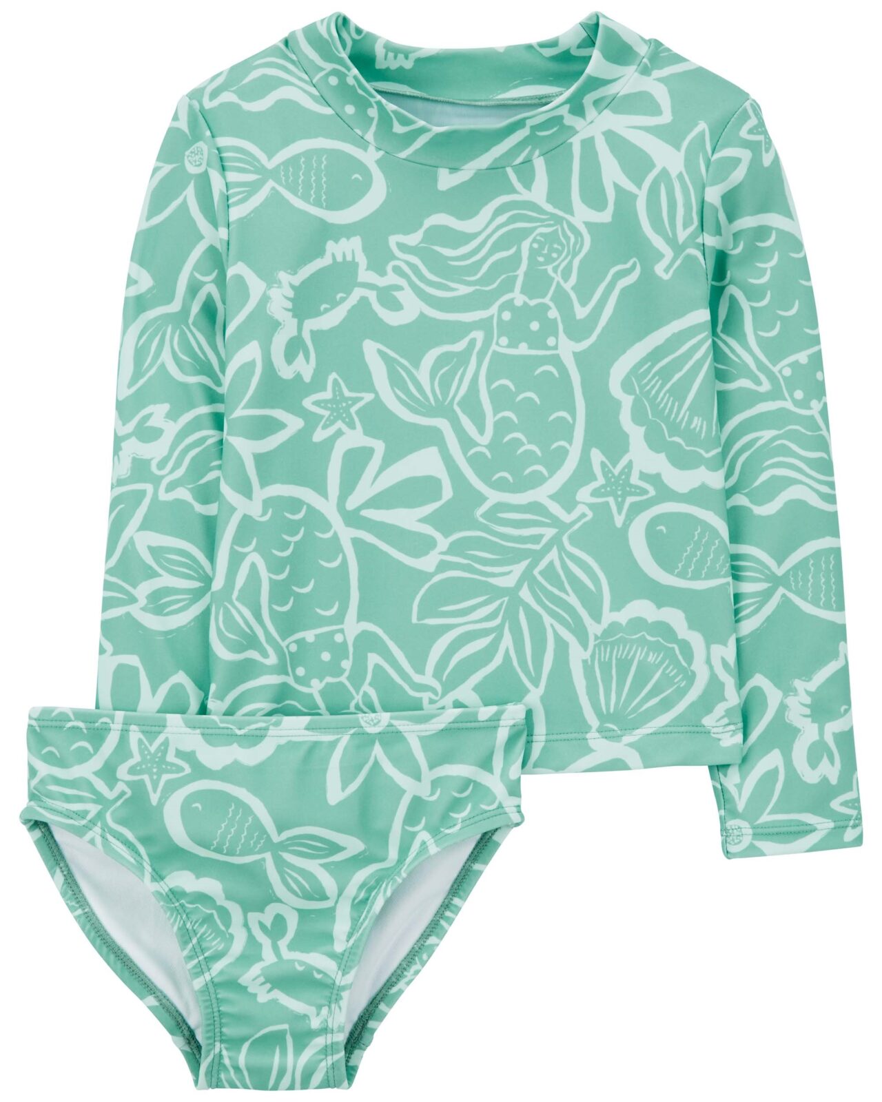 ¡Bienvenido verano! Encantador conjunto de baño compuesto por un buzo de mangas largas y cuello redondo con un original estampado de sirenas y motivos marinos, combinado con un bikini a juego. Confeccionado en una tela suave, liviana y de secado rápido con protección solar UPF 50+, brinda comodidad, frescura y resguardo tanto en la playa como en la piscina.
