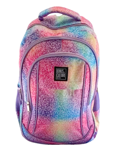 Mochila Bonus Culture con diseño esfumado arcoíris, equipada con tres compartimentos con cierre y un bolsillo frontal práctico. Los bolsillos laterales de red permiten llevar botellas cómodamente. Es liviana, resistente y fácil de usar. Su diseño multicolor destaca por su estilo vibrante y original.