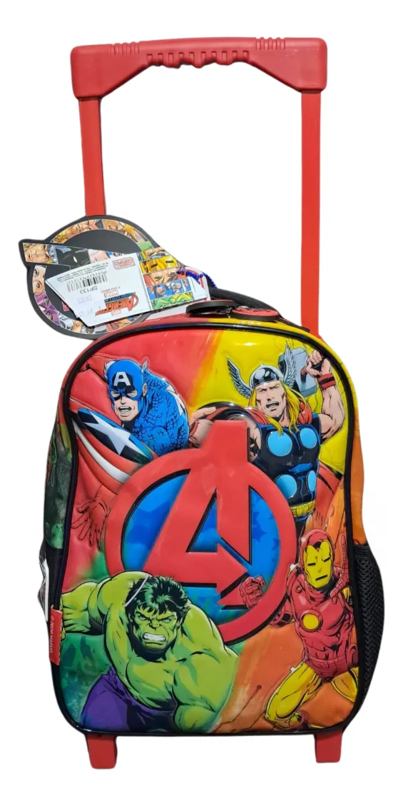 Mochila con carro diseño Avengers, pensada para los primeros años de escuela o jardín. Cuenta con un compartimiento principal amplio con cierre, bolsillo lateral para la botella y mango retráctil. Su estructura con dos ruedas facilita el traslado, mientras que las tiras regulables y acolchadas permiten usarla también como mochila tradicional. Ideal para llevar cuadernos, vianda y los imprescindibles de cada día.