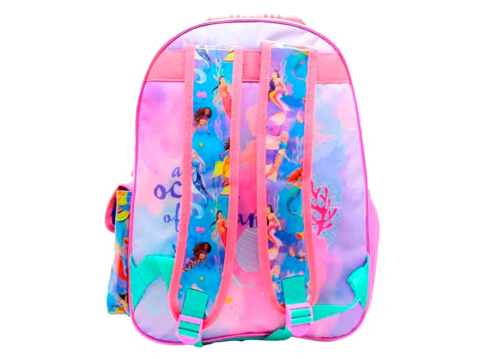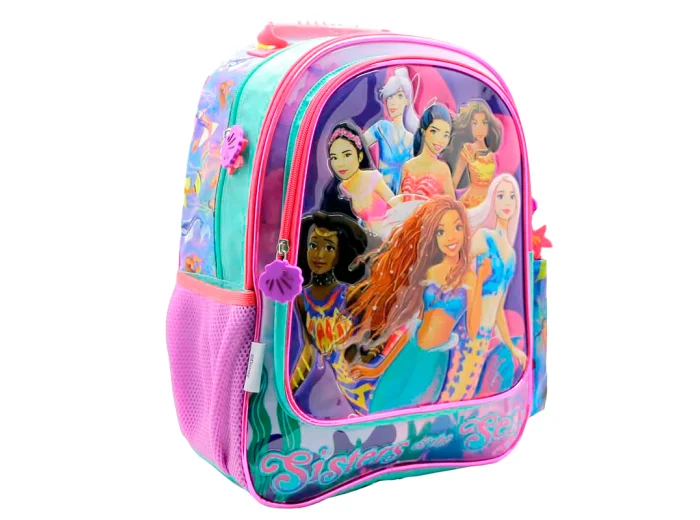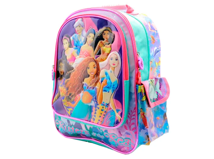 Mochila diseño La Sirenita Sisters of the Sea, de Cresko. Confeccionada en poliéster duradero, ofrece un amplio compartimento principal y dos grandes bolsillos frontales. Además cuenta con un bolsillo lateral de rede ideal para la botella, y otro con solapa para guardar esos pequeños accesorios. Sus tiras regulables permiten un ajuste cómodo en la espalda. Es el accesorio perfecto para llevar un toque de fantasía y funcionalidad a cada día escolar.