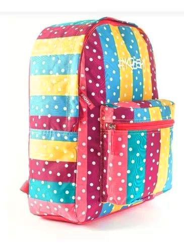 Mochila escolar con un diseño alegre y súper colorido en rayas multicolor con lunares blancos. Fabricada en poliéster resistente, combina practicidad y durabilidad para el uso diario. Su compartimento principal ofrece buen espacio para libros y carpetas, mientras que el bolsillo frontal permite tener a mano los accesorios más pequeños. La espalda ergonómica aporta comodidad durante todo el día.
