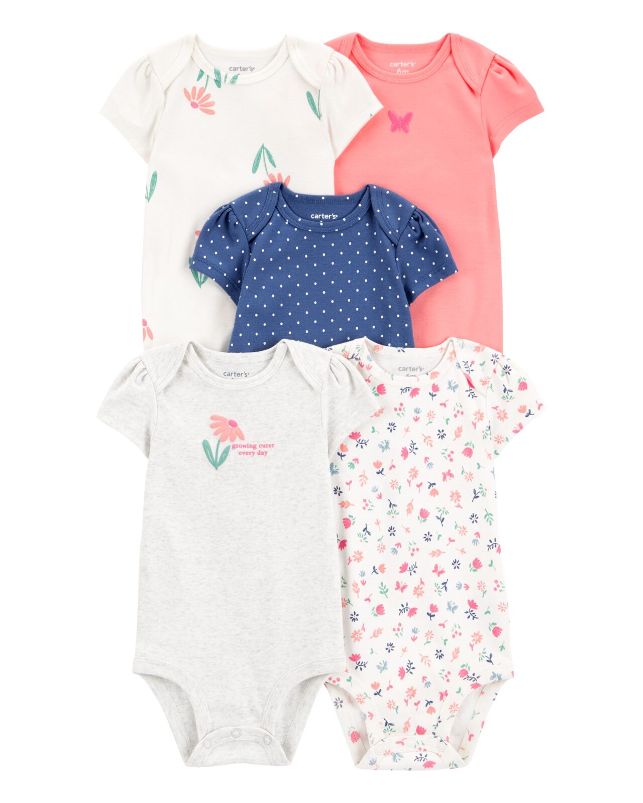 Body Carter’s de manga corta con delicado frunce en los hombros. Confeccionados en 100% algodón acanalado, suave y fresco para el uso diario. Incorporan hombros superpuestos y broches resistentes en las piernas para vestir y cambiar al bebé fácilmente. Variedad de estampados florales en diferentes colores, combinando delicadeza y elegancia en cada diseño.