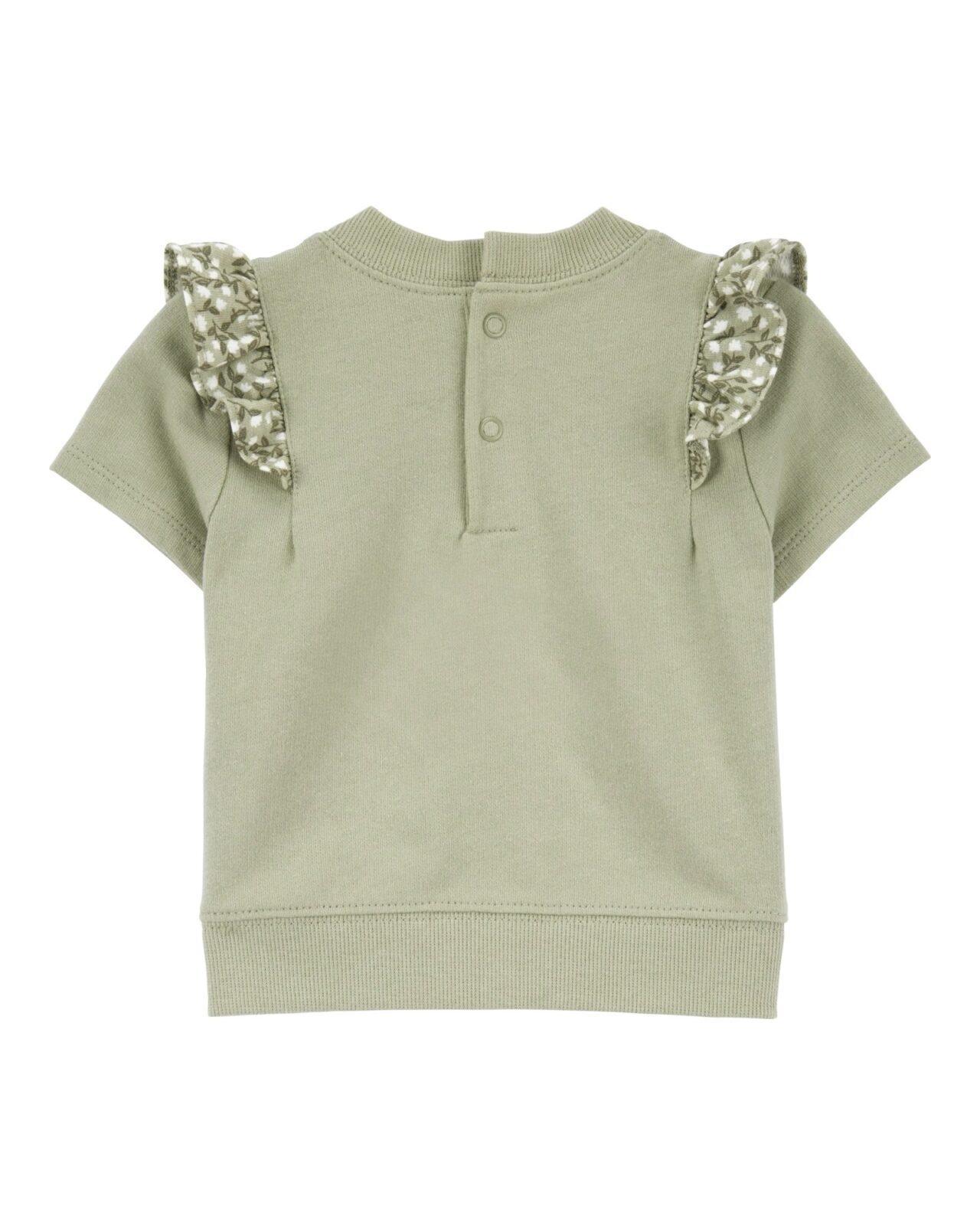 Set de 3 piezas en tonos de verde con volados estampados. Este encantador conjunto incluye un short floreado con cintura y puños elásticos, un buzo de mangas cortas con delicados volados al frente y cierre con botones en la espalda, y un body clásico de manga corta. Confeccionado en 100% algodón, ofrece a tu bebé estilo, suavidad y confort.