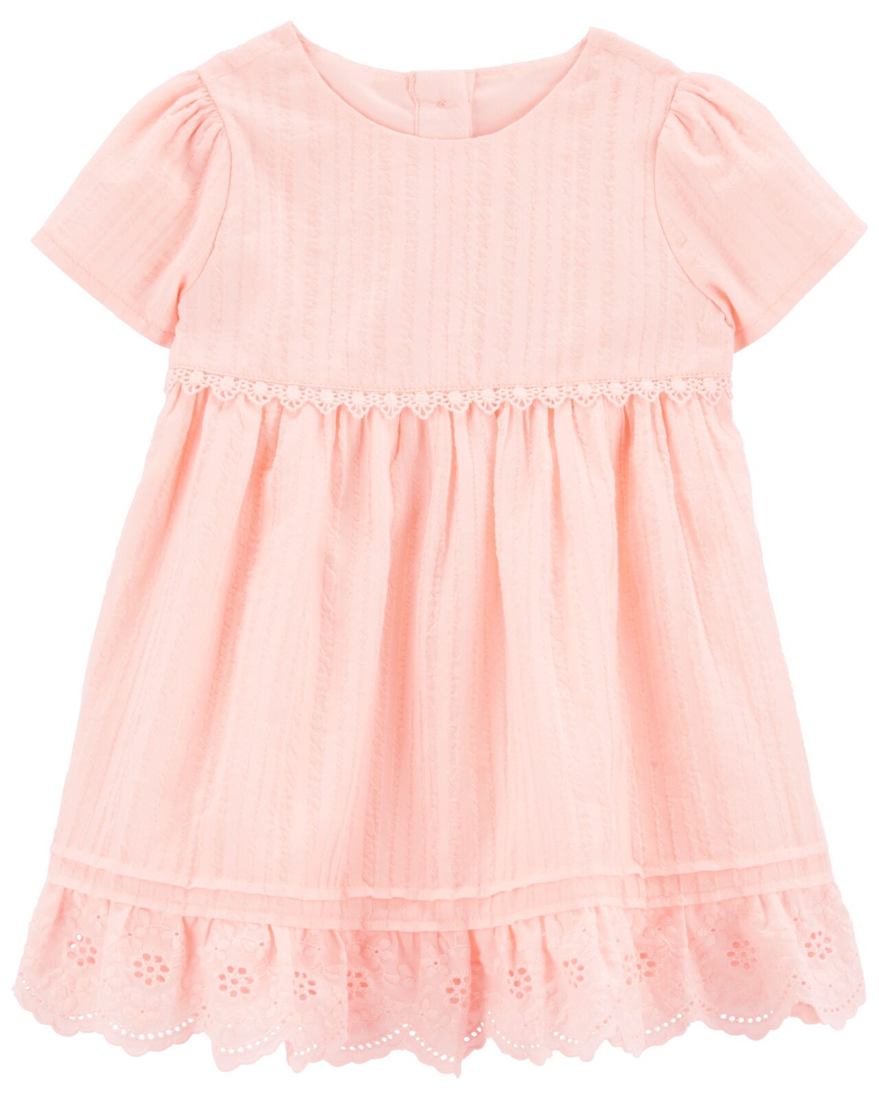 Adorable vestido rosado manga corta con frunce en los hombros. Tiene el cuello redondo y delicadas terminaciones de puntilla en el pecho y la falda. Cuenta con prácticos botones en la espalda que facilitan la colocación. Incluye un bombachita cubrepañal a juego para completar el look.  Ideal para ocasiones especiales, combina encanto y comodidad.